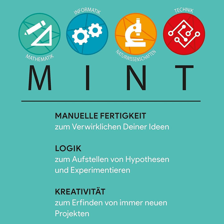 - Programmieren lernen: Der Elektronik-Baukasten lässt Ihr Kind seinen eigenen Roboter bauen – er schult technisches Verständnis, die Hand-Augen-Koordination und ermöglicht schliesslich viele Beschäftigungsmöglichkeiten