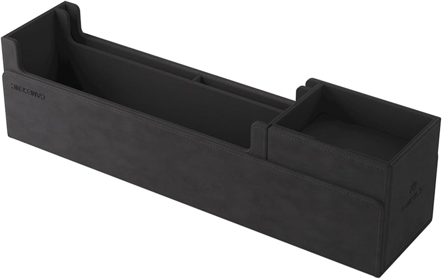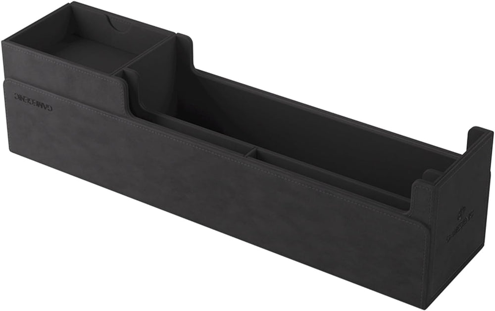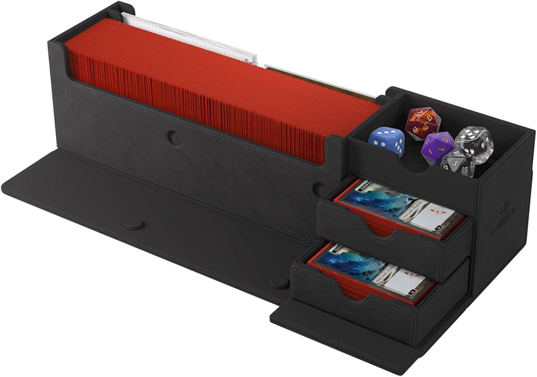 - 2 herausnehmbare Schubladen für Marker, Würfel, gesleevte Karten oder komplette Decks. Die Schubladen bieten Platz für jeweils 40 zusätzliche, doppelt gesleevte Karten (oder 50 Karten in Brettspiel-Kartenhüllen)