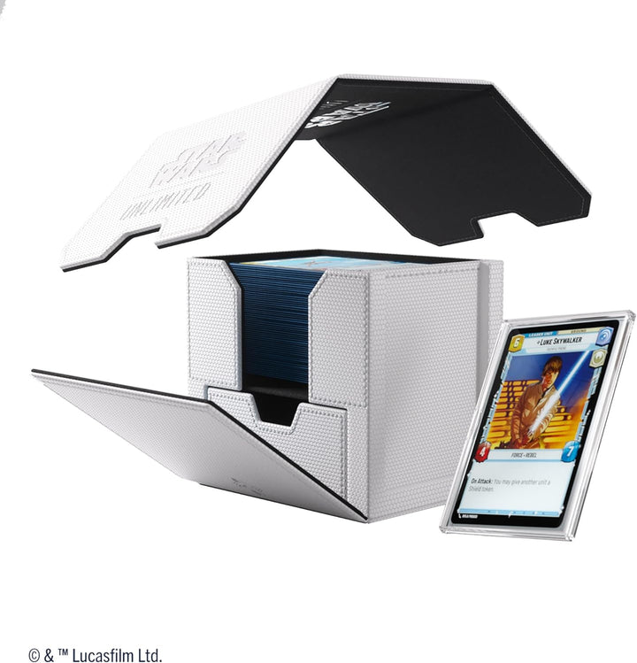 - Die Box enthält ein Slide Card Case mit zusätzlichem UV-Schutz für die Anführer-Karte, welches von aussen sichtbar und entnehmbar ist