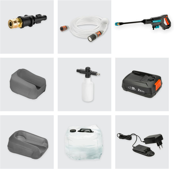 - Lieferumfang beinhaltet: 1x Gardena Akku Mitteldruckreiniger AquaClean 24/18V P4A solo, 1x 0°, 15° und 40° Düse, 1x lange und kurze Lanze, 1x OGS Anschluss für den Gartenschlauch, 1x 5 m Saugschlauch mit OGS Anschlüssen und Filter, je 1x
