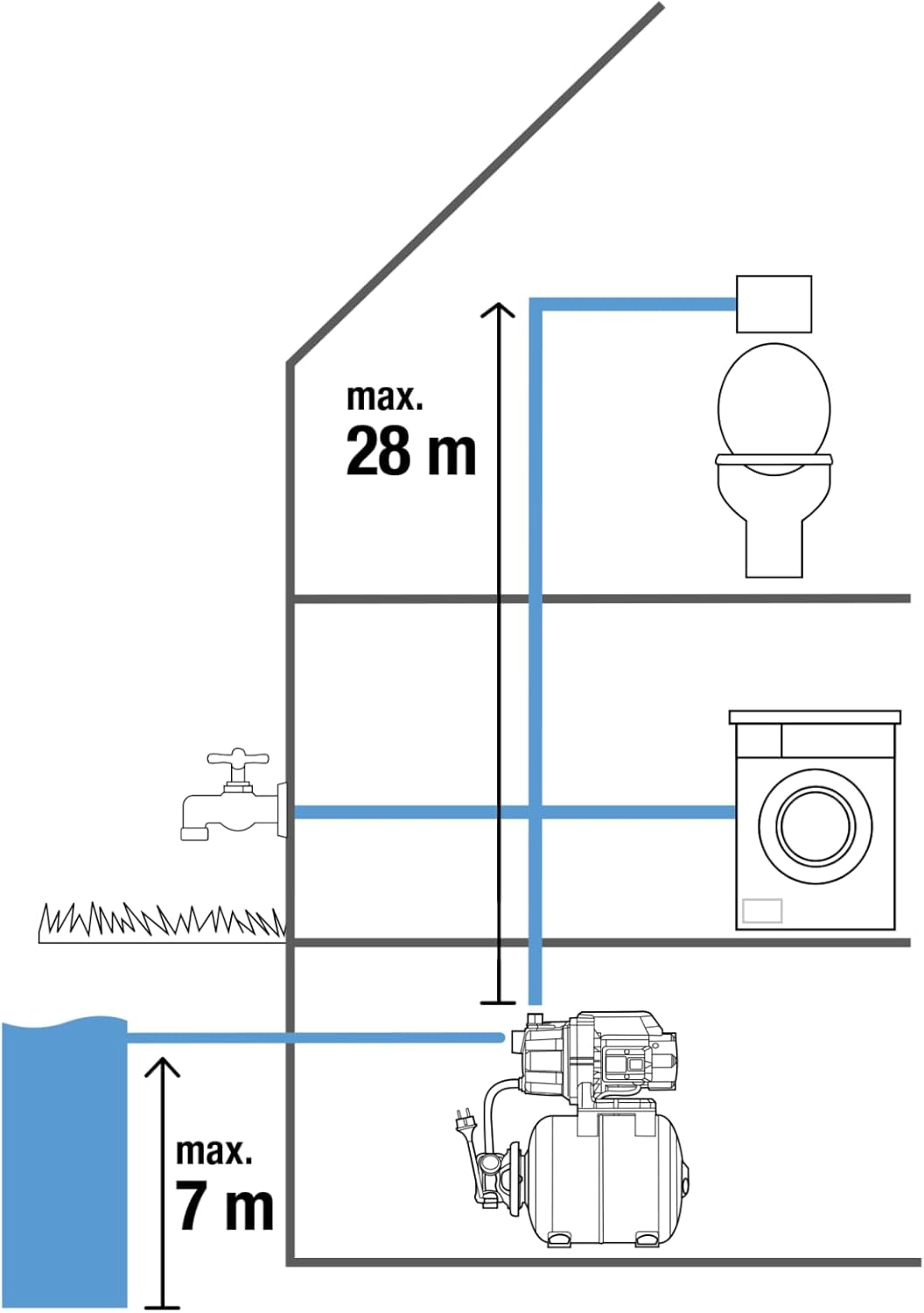 • Motorleistung: 800 W Nennleistung, max. Fördermenge 3700 l/h, max. Förderhöhe 41 m, max. Selbstansaughöhe 7 m - längere Lebensdauer dank EPDM-Membran und 19L Tankvolumen