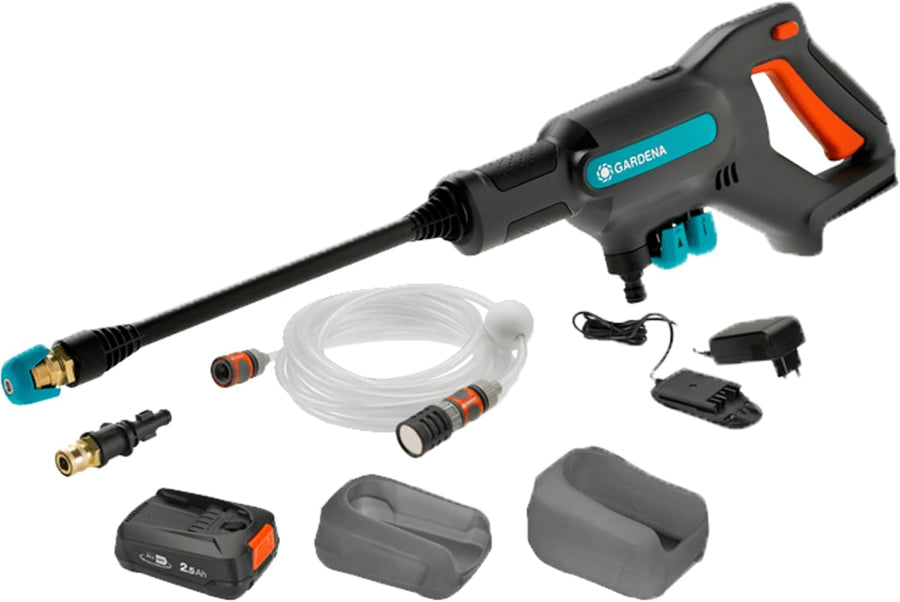 - Lieferumfang beinhaltet: 1x Gardena Akku Mitteldruckreiniger AquaClean 24/18V P4A solo, 1x 0°, 15° und 40° Düse, 1x lange und kurze Lanze, 1x OGS Anschluss für den Gartenschlauch, 1x 5 m Saugschlauch mit OGS Anschlüssen und Filter, je 1x Akkuschutzhülle klein und gross , Akku P4A PBA 18V/45 2.5 Ah, 1x Ladegerät