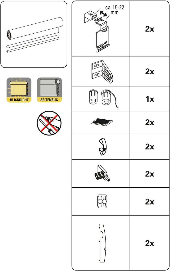- Fixierung mit Klemmträgern: Einfacher Zusammenbau der Einzelteile, Befestigung des Rollos am oberen Fensterflügel durch Aufstecken von zwei Klemmträgern, Geeignet für Fensterflügel von 15 bis 22 mm Dicke