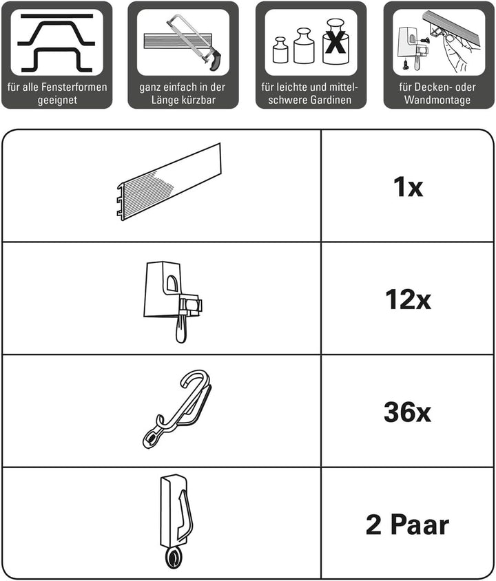 - Zubehör inklusive: 12 Träger für Decken- oder Wandmontage, 4 Endkappen (für 2 geteilte Vorhangschienen) und 36 Gleiter