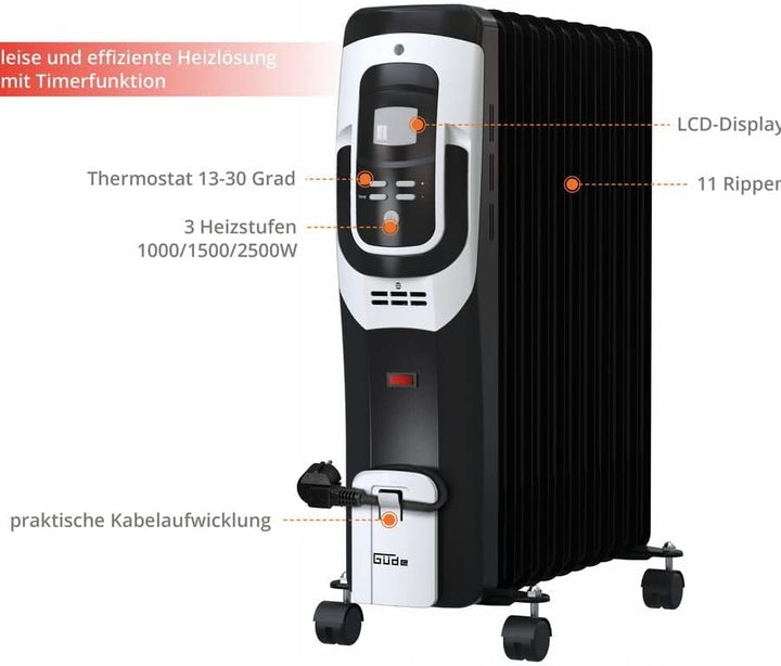- EFFIZIENTE HEIZLEISTUNG: Der Güde Ölradiator OR 2500-11 DT liefert mit 3 wählbaren Heizstufen (1000/1500/2500 W) und 11 Rippen eine zuverlässige Wärmeleistung in verschiedenen Räumen - von Wohnräumen bis zu Werkstätten
