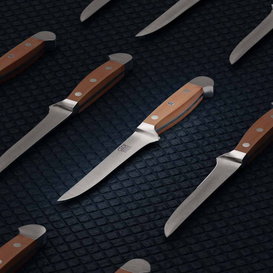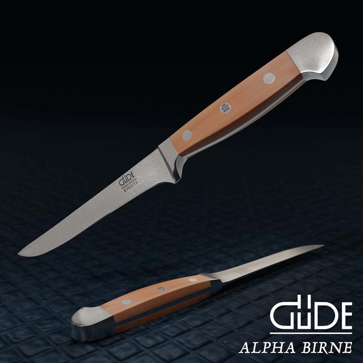 - Das aus einem Stück im Gesenk geschmiedete Messer, wird in über 40 manuellen Arbeitsgängen von Hand, in ein einzigartiges Meisterstück verwandelt. Diese Leidenschaft, bestückt mit edlem Birnenholz, lassen kulinarische Herzen höher schlagen