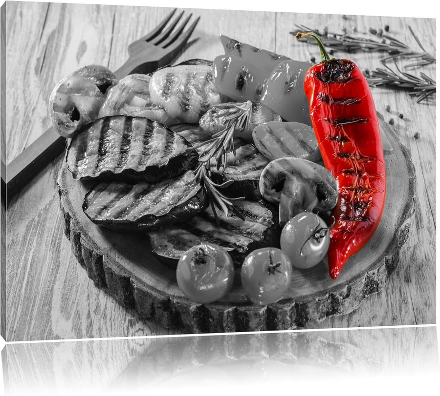 gegrilltes Gemüse auf Baumstammteller schwarz/weiss Format: 100x70 auf Leinwand, XXL riesige Bilder