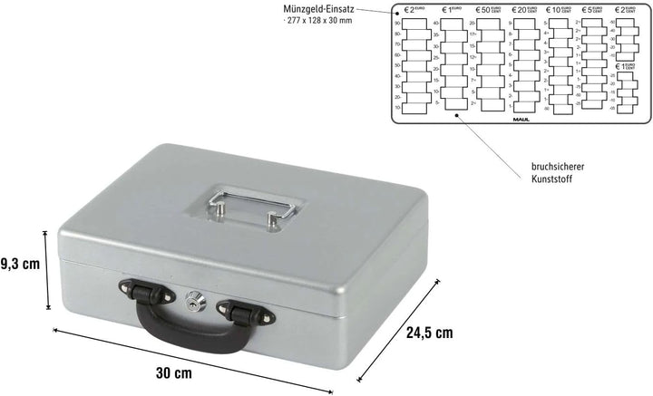 - Masse der Geldkassette: 30 x 24,5 x 9,3 cm.