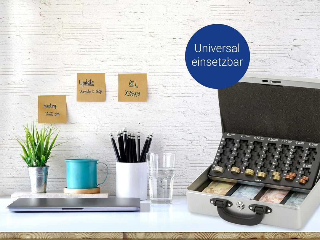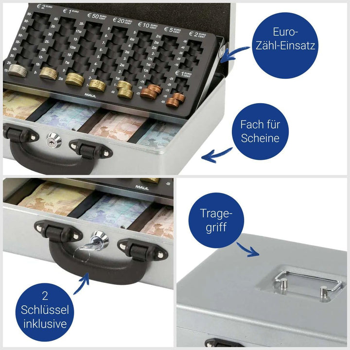- Die Geldkassette ist aus nahtlos gezogenem, lackiertem Stahl gefertigt und mit einem praktischen Zähleinsatz ausgestattet