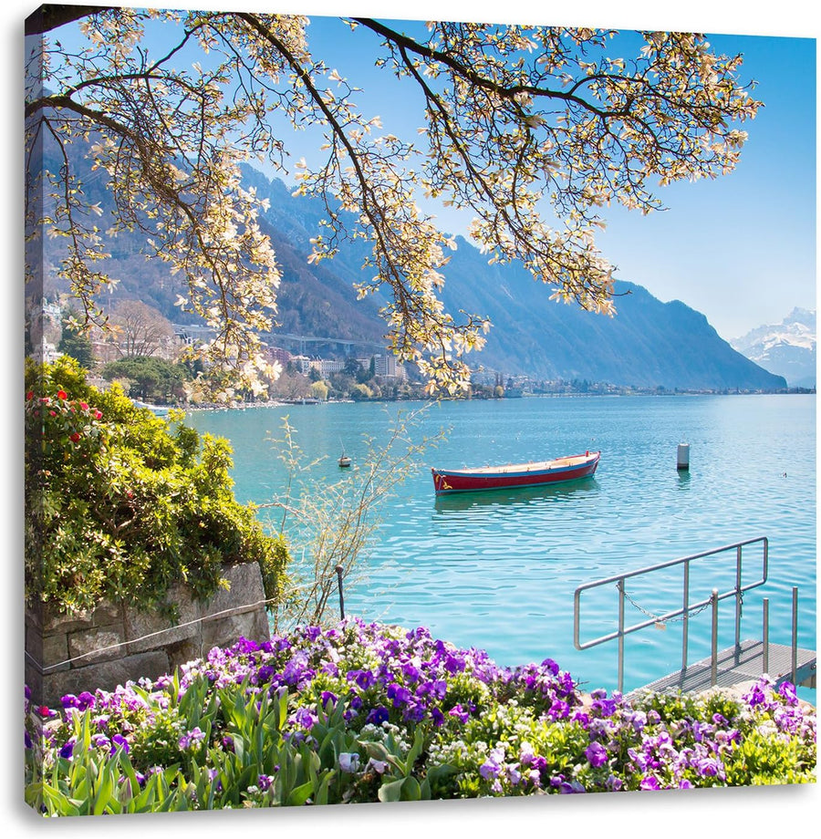Genfer See im Sonnenschein, Format: 70x70 auf Leinwand, XXL riesige Bilder fertig gerahmt mit Keilra