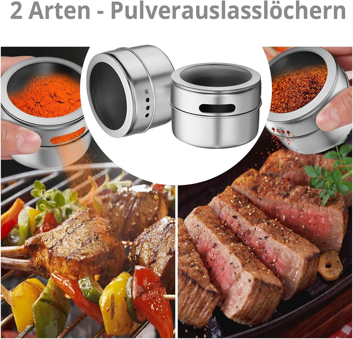 - 【Packungsinhalt】12 x magnetische Gewürzdosen, 1 x Edelstahl-Chassis, 5 Blatt Gewürzetikettenpapier, 12 x selbstklebende Blätter. (Hinweis: Edelstahl-Chassis sind scharf, mit Vorsicht zu verwenden)