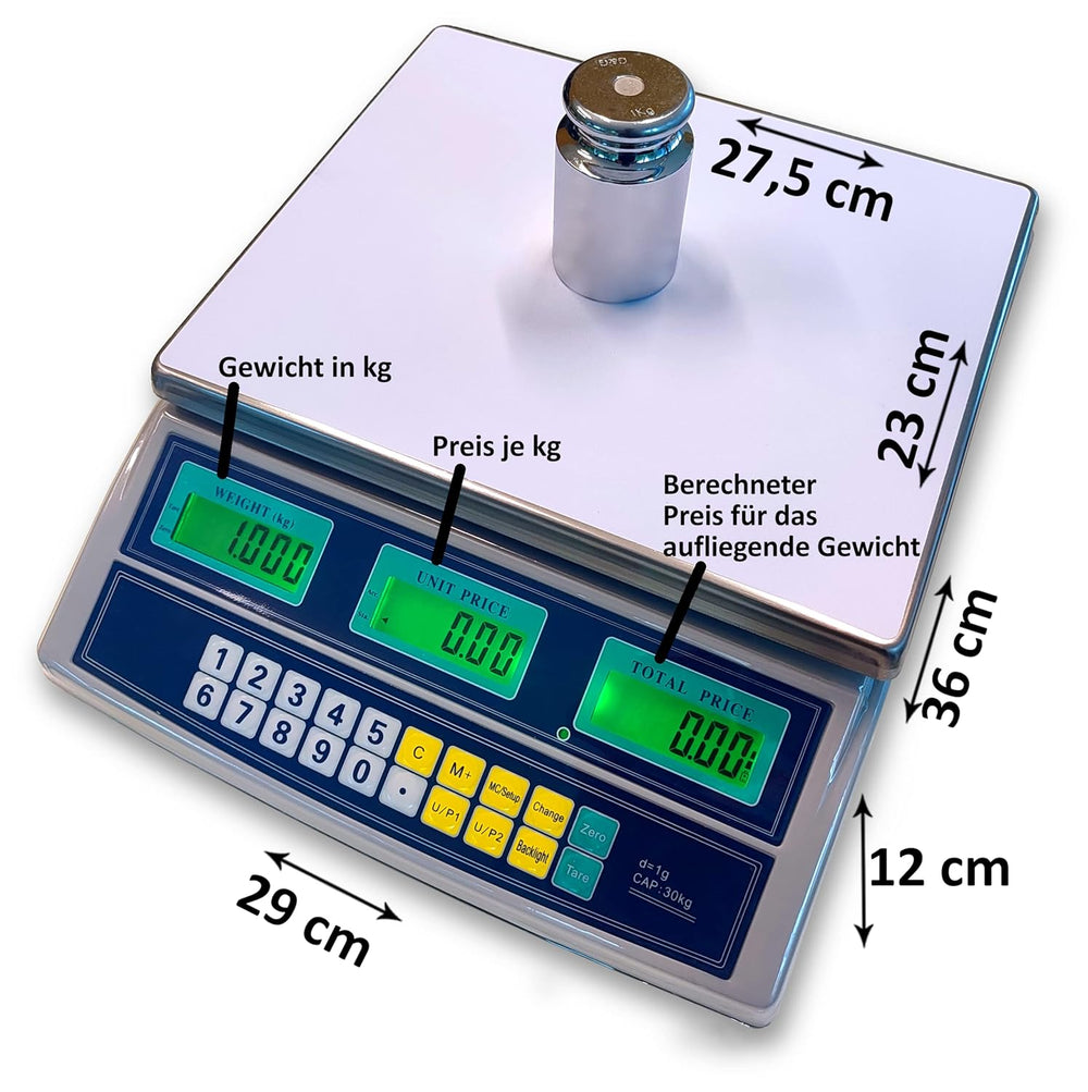 - Digitale Tischwaage mit Preisberechnungs-Funktion & Preisspeicherung. Wiegt äusserst präzise bis 30kg in 1g-Schritten.
