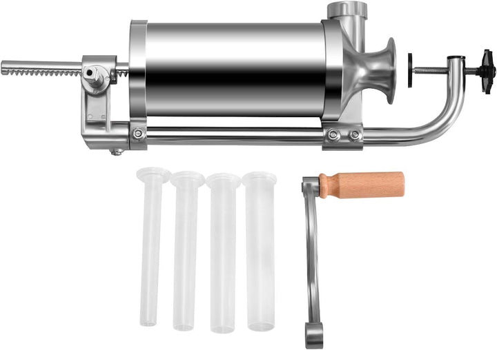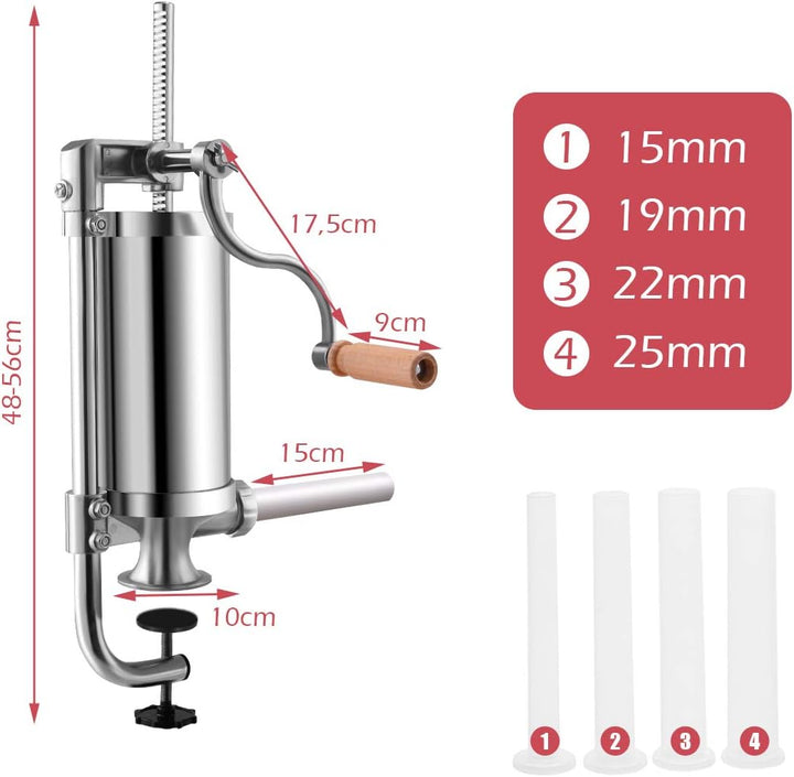 • 🥓 4 Füllrohre mit unterschiedlichen Durchmessern - Der Wurstfüller verfügt über 4 Füllrohre in unterschiedlicher Grösse: Durchmesser 15mm, 19mm, 22mm und 25mm. So können Sie Würste und Schinken in verschiedenen Grössen herstellen, um Ihren Anforderungen gerecht zu werden.