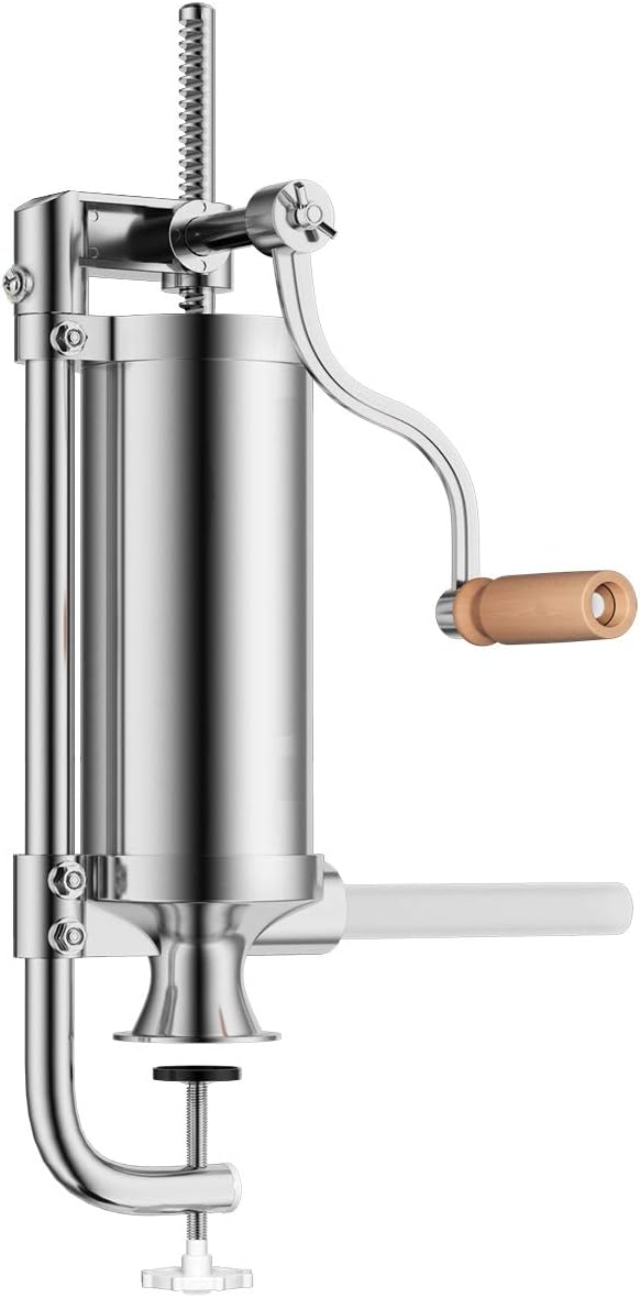 • 🥓 Hohe Qualität und leichte Reinigung - Dieser Wurstfüller ist aus hochwertigem Edelstahl und Aluminium gefertigt, die Rost wirksam verhindern können, und ist sehr langlebig, so dass die Wurstfüllmaschine eine lange Lebensdauer besitzt. Darüber hinaus ist solches ausgezeichnete Material leicht zu reinigen und braucht einfach nur mit Wasser gespült werden.