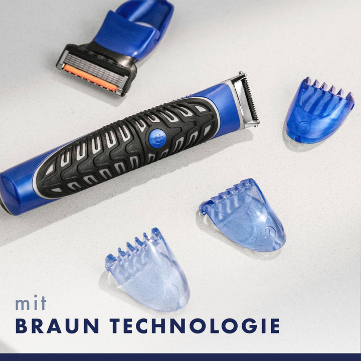 - LIEFERUMFANG: 1 Trimmer, 1 ProGlide Rasierklinge, 3 Kammaufsätze (für verschiedene Haarlängen), 1 Batterie