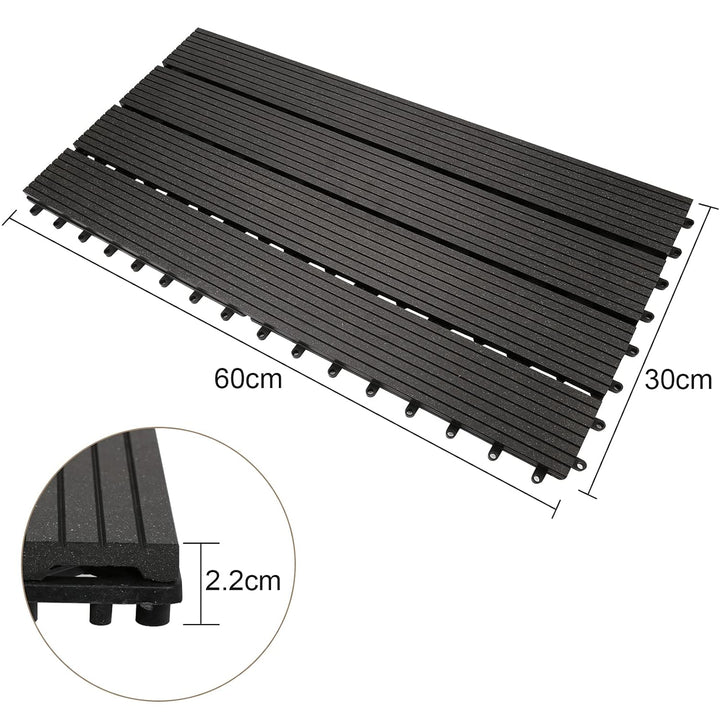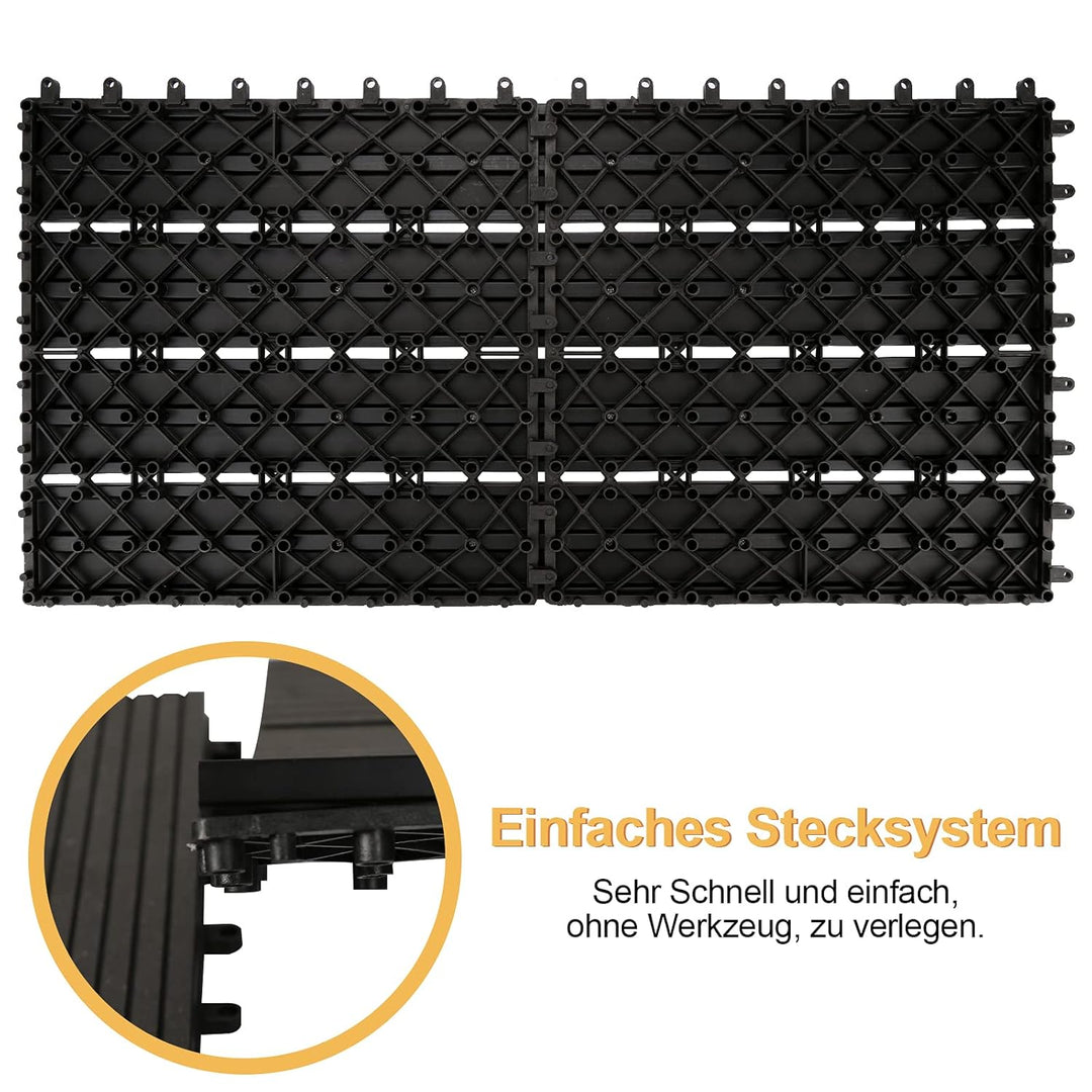 - đ´ăWPC TerrassenfliesenăMasse: ca.30x60x2,2cm (Die Terrassenfliesen sind 30x30cm gross, fĂźr einen m² sind ca. 11 Fliesen notwendig).Farbe: Anthrazit, Material: WPC (50% Holz, 50% Kunststoffgemisch)100% recyclable and environmentally friendly.