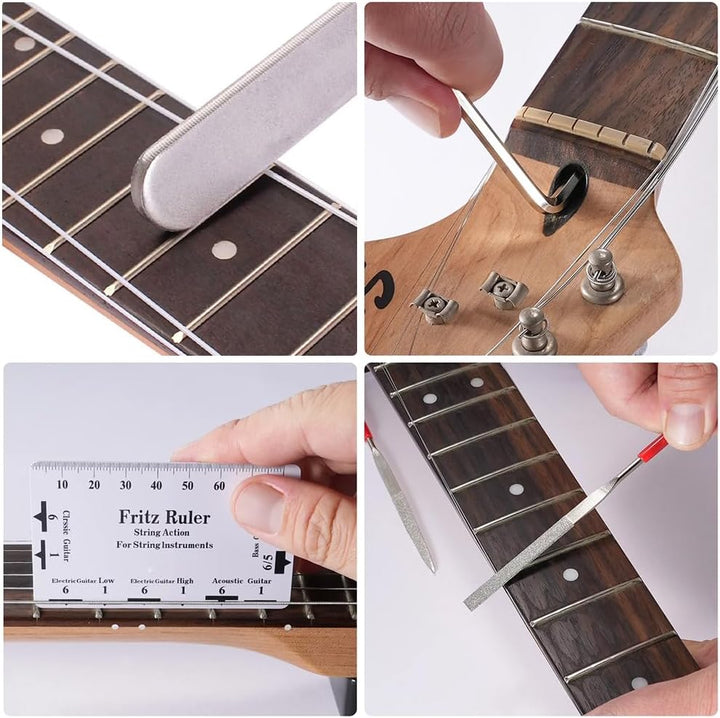 - [Gitarren Pflegeset]: Gitarren Konfiguration Kit enthält 11 Arten Mini-Diamant-Körnungsfeilen-Set, Saitenaktion-Lineal, Messwerkzeug, Gitarren-Halsspannstab-Inbusschlüssel. Gitarre Reparatur-Kit geeignet für Arten von Gitarrenreparaturen; speziell