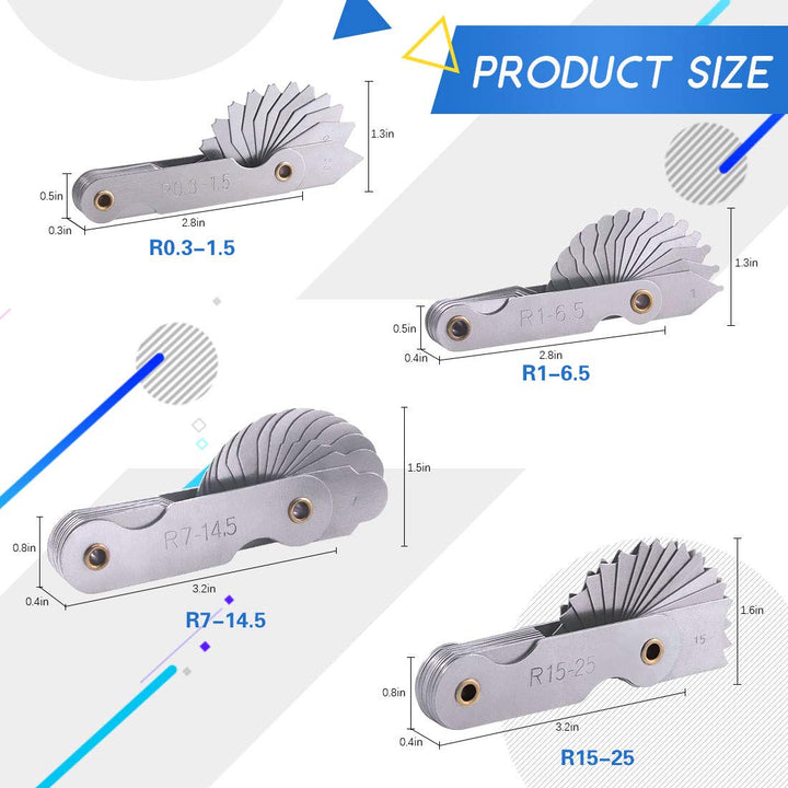 - ★【Was Sie erhalten】: In diesem Radiuslehren-Set sind 4 Stück Radiusrundungslehre enthalten, deren Messbereiche R0,3-1,5mm, R1-6,5mm, R7-14,5mm, R15-25mm sind. Sie sind gut verpackt in einer Plastikbox, leicht zu tragen und zu lagern.
