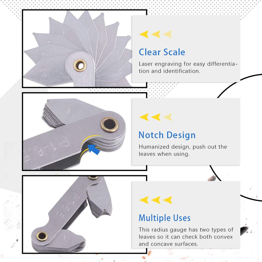 - ★【Einfach zu bedienen】: Das Radiusmessgerät verfügt über zwei Arten von Blättern, jedes Blatt ist deutlich markiert, sodass Sie bequem erkennen können, welches Blatt Sie benötigen. So kann es die konvexen und konkaven Oberflächen