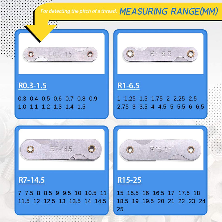 - ★【Messbereichsdetail】: R0,3-1,5 mm beträgt 0,3/ 0,4/ 0,5/ 0,6/ 0,7/ 0,8/ 0,9/ 1,0/ 1,1/ 1,2/ 1,3/ 1,4/ 1,5; R1-6,5 mm ist 1/ 1,25/ 1,5/ 1,75/ 2/ 2,25/ 2,5/ 2,75/ 3/ 3,5/ 4/ 4,5/ 5/ 5,5/6/ 6,5; R7-14,5 mm ist 7/ 7,5/ 8/ 8,5/ 9/ 9,5/ 10/ 10,5/ 11/