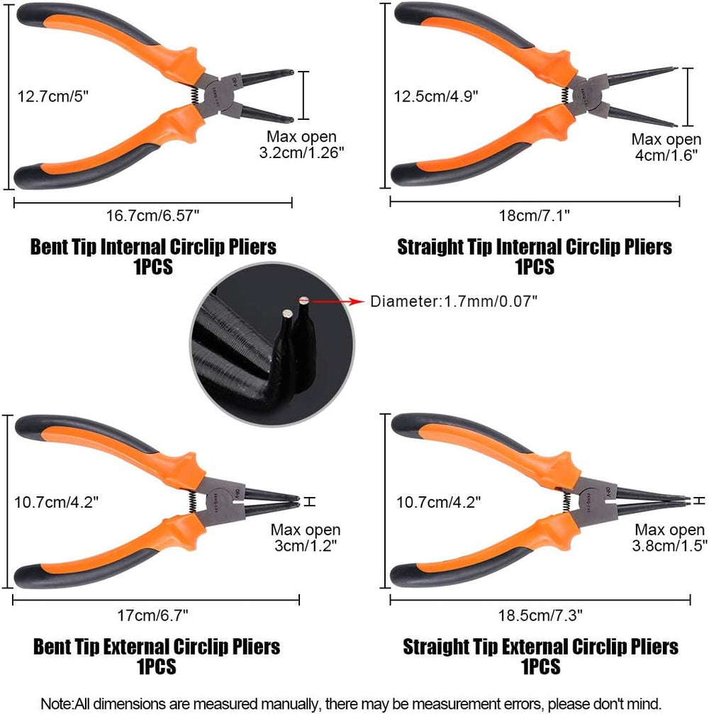 - ★ What You Get: In this set, it include 7-inch straight tip internal circlip plier, 7-inch straight tip external circlip plier, 7-inch bent tip internal circlip plier, 7-inch bent tip external circlip plier total 4pcs snap ring pliers well packaged in