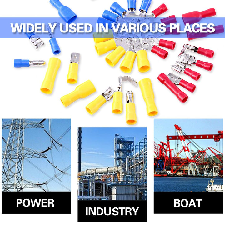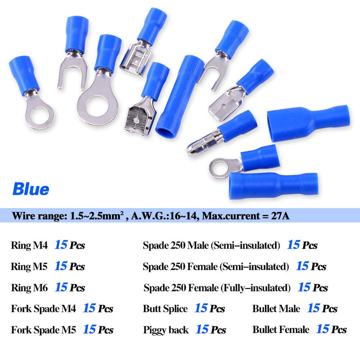 - Package includes: fully / semi female / male insulated spade fork ring butt bullet Piggy back quick disconnect insulated crimp terminals connectors