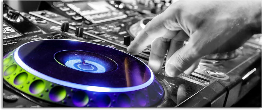 Glasbild Panorama | Wandbild aus Echtglas | DJ bei der Arbeit am Plattenteller | 100x40 cm | inkl. A