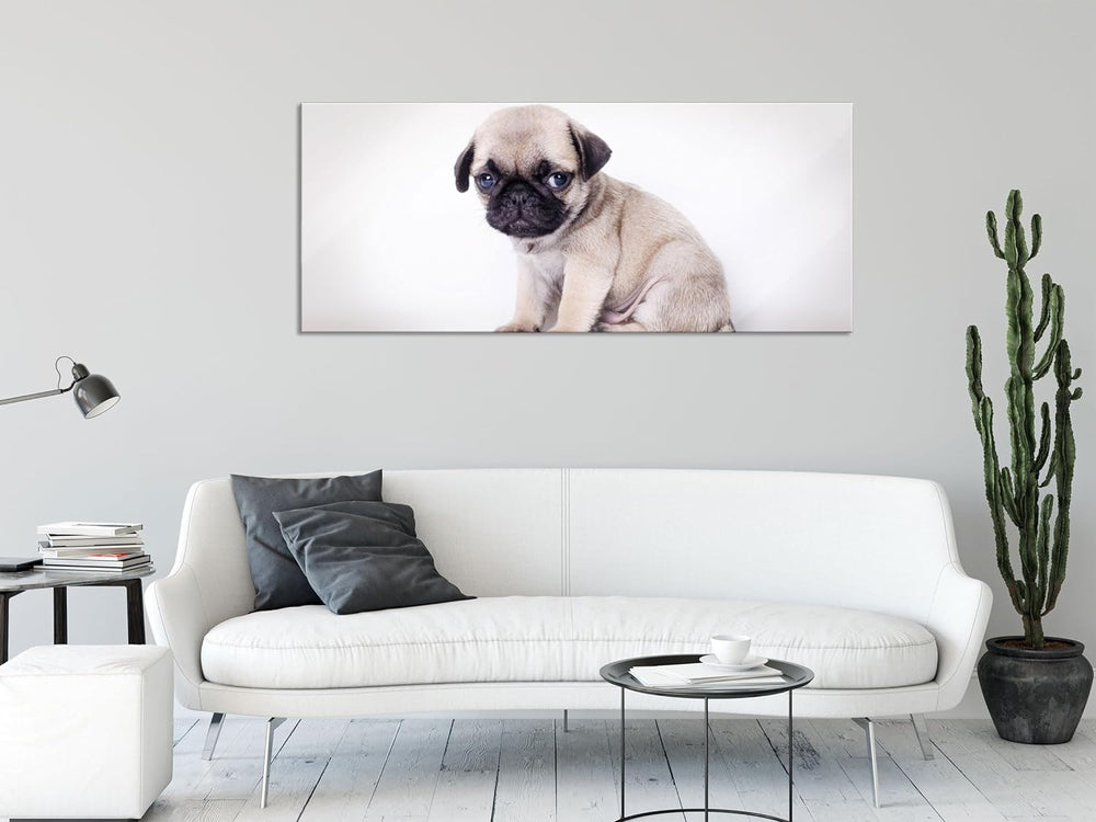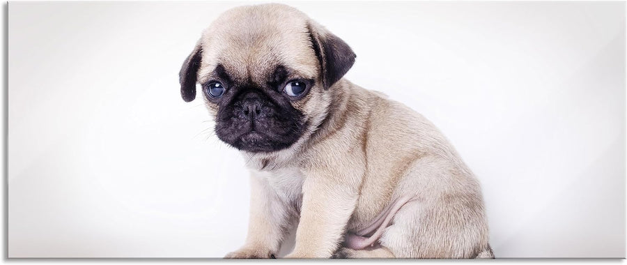 Glasbild Panorama | Wandbild aus Echtglas | Kleiner Hundewelpe Mops | 100x40 cm | inkl. Aufhängung u