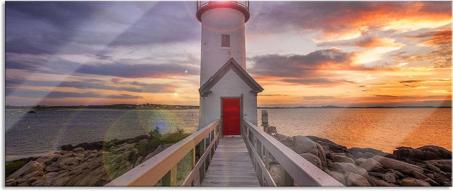 Glasbild Panorama | Wandbild aus Echtglas | Leuchtturm bei Sonnenuntergang | 100x40 cm | inkl. Aufhä