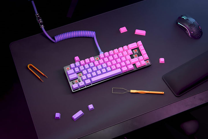 - Austauschbare mechanische Schalter und Tastenkappen. Die Hot-Swap-Sockel des GMMK 2 Compact (65%) sind speziell für leichte Installation beliebiger 5-poliger Schalter konstruiert. Mechanische Schalter von Glorious, Cherry, Kailh, Gateron, Glorious Panda