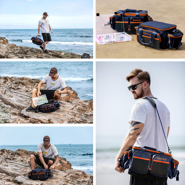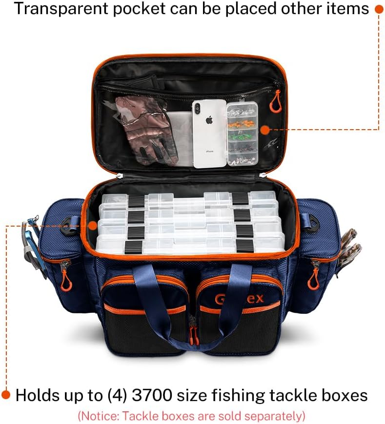 • Grosse Kapazität: Masse: 37 x 23 x 25 cm, Angelausrüstung Tasche kann (4) 3700 transparente Angelboxen (4 Stück Angelboxen sind separat erhältlich), 6 externe Aufbewahrungstaschen können Angelausrüstungszubehör, Köder, Zange, Angelräder usw.