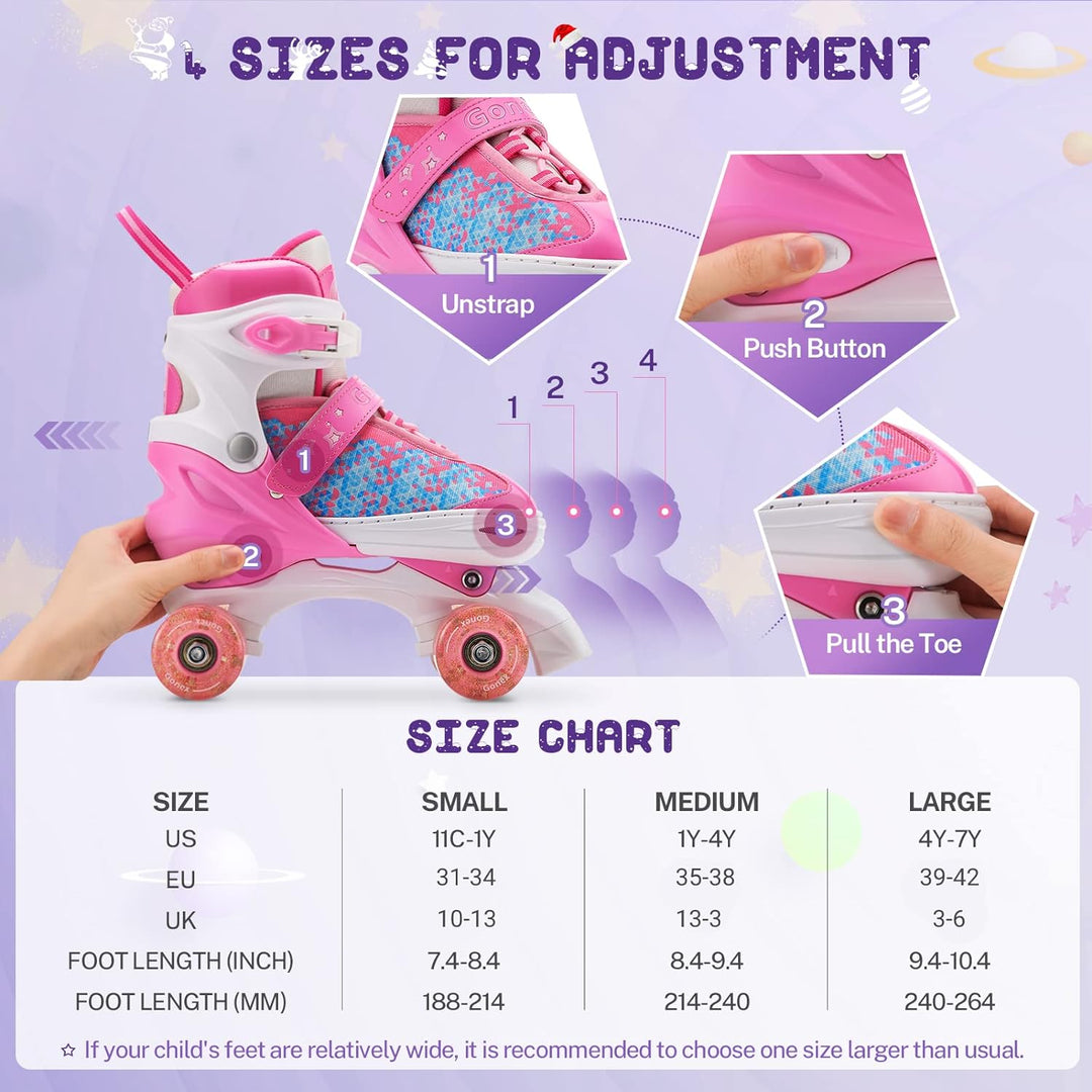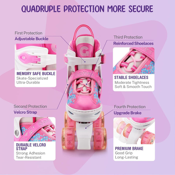 - 【Verstellbare Rollschuhe - 4 Verschiedene Grössen】 Design mit einfach verstellbarem Druckknopf, Gonex Rollschuhe können auf 4 verschiedene Grössen eingestellt werden, um sich an unterschiedliche Fusslängen anzupassen, was die perfekte Wahl für