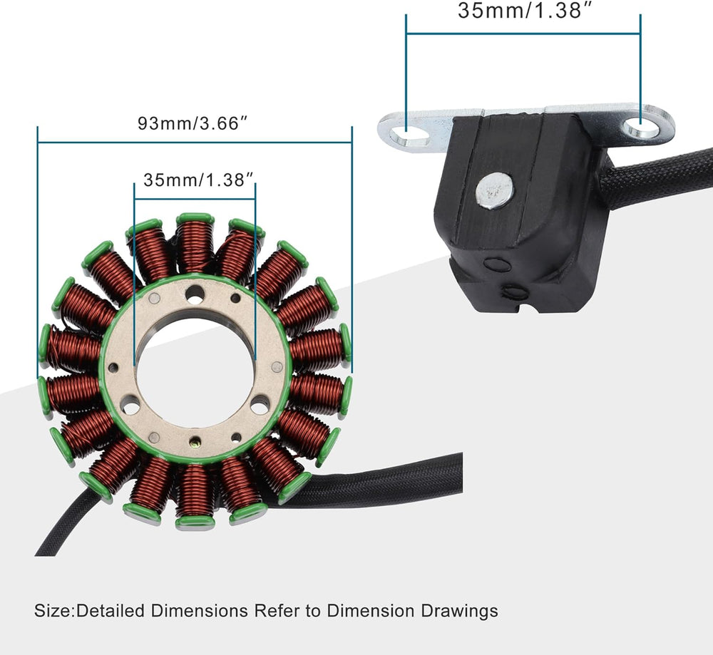 - 1:Grösse: 18 suple 7 Drähte ; Aussendurchmesser der Statorspule :93mm Innendurchmesser :34.5mm Fester Lochdurchmesser der Installationsschraube:35mm (Detaillierte Messdaten, bitte Bild sorgfältig prüfen)