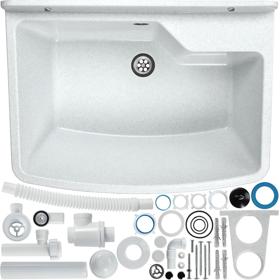 - ☑️ DAS PRODUKT VERFÜGT ÜBER EINE STÜTZE, die das Spülbecken absichert sowie notwendige Dübel, Schrauben, Blenden und eine Gebrauchsanweisung. Das Spülbecken kann man unterschiedlich anbringen: in die Arbeitslatte in der Waschküche einlassen