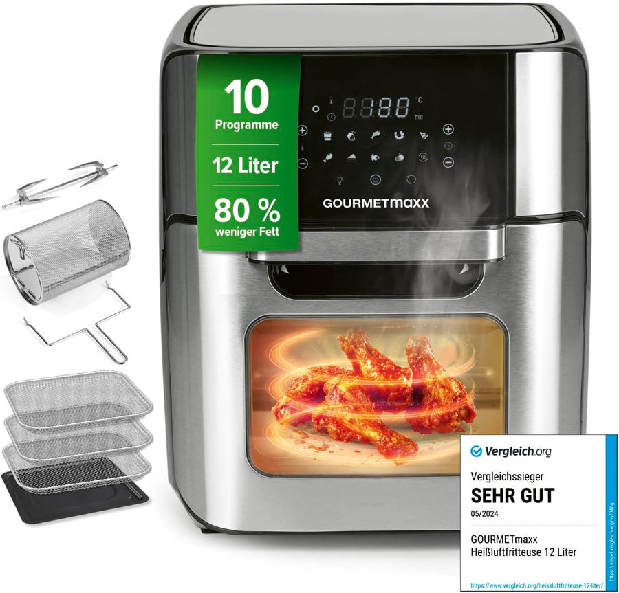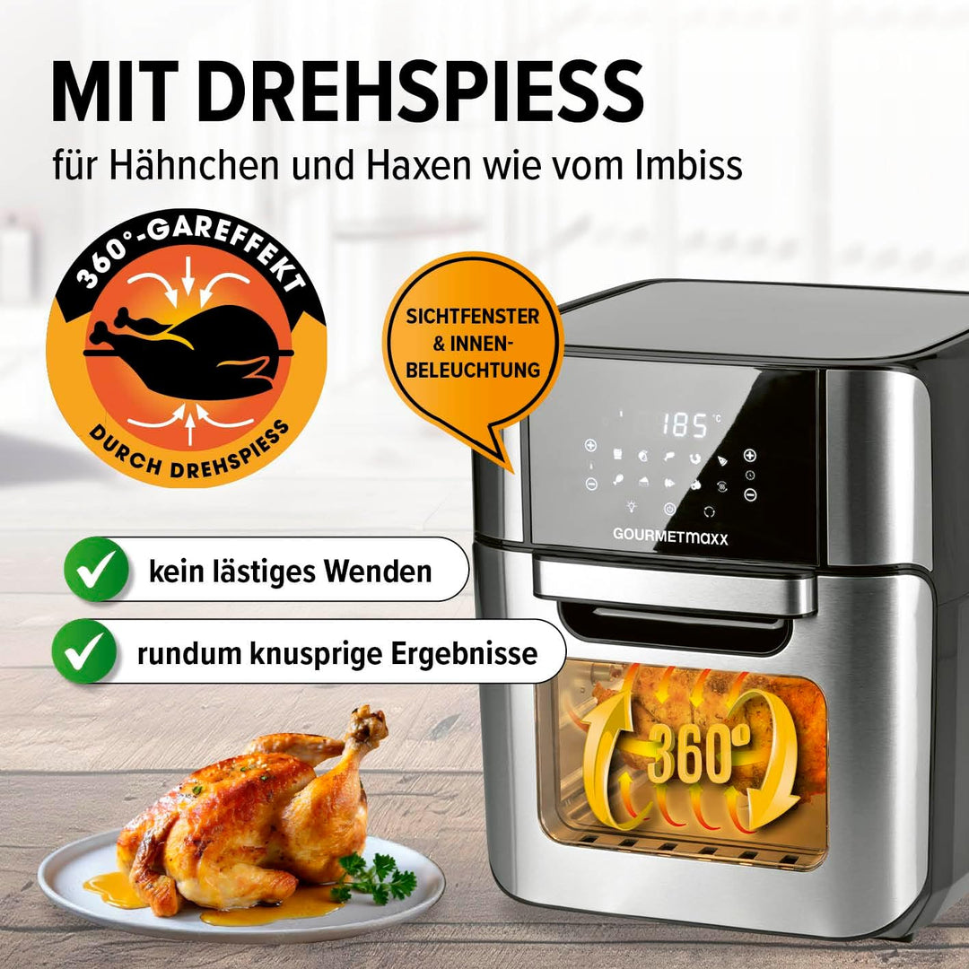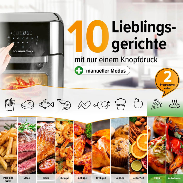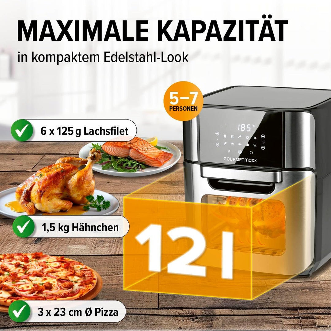 - FETTARM FRITTIEREN: Die GOURMETmaxx Heissluftfritteuse 12 l sorgt dank 1800 W, Temperaturen bis 200° & 360°-Rapid-Air-Technologie für die optimale Wärmeverteilung – für aussen krosse & innen saftige Snacks. Geniesse schonendes & geruchsarmes Garen