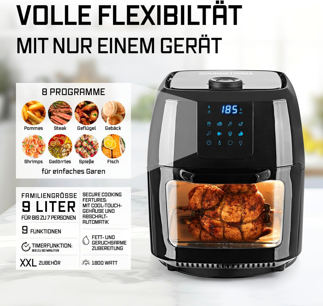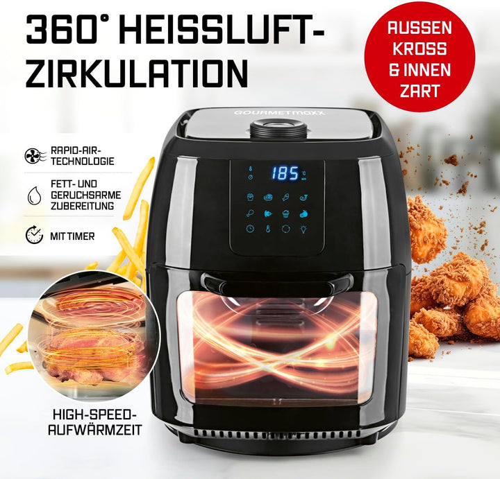 - FRITTEUSE OHNE ÖL - Die GOURMETmaxx Heissluftfritteuse macht es Ihnen möglich besonders fettarm und schonend zu kochen. Sie hält konstant die gewählte Temperatur, sodass jedes Gericht per Timer perfekt und auf den Punkt zubereitet werden kann.