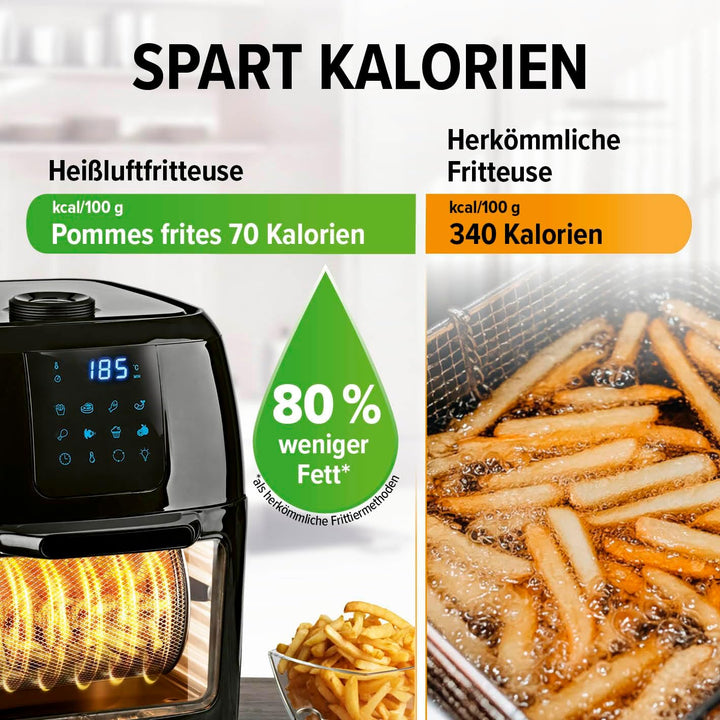 - UMFANGREICHE FUNKTIONEN - Unsere XXL Heissluftfritteuse mit besonders grossem Füllvolumen kombiniert einen elektrischen Ofen und einen Drehgrill. Gerade zum Frittieren, Grillen, Dörren, Braten, Gratinieren, Backen, Auftauen, Erhitzen & Warmhalten ist die Frittöse ideal geeignet.