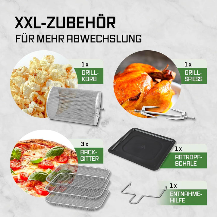 - UMFANGREICHE FUNKTIONEN - Unsere XXL Heissluftfritteuse mit besonders grossem Füllvolumen kombiniert einen elektrischen Ofen und einen Drehgrill. Gerade zum Frittieren, Grillen, Dörren, Braten, Gratinieren, Backen, Auftauen, Erhitzen & Warmhalten ist die Frittöse ideal geeignet.