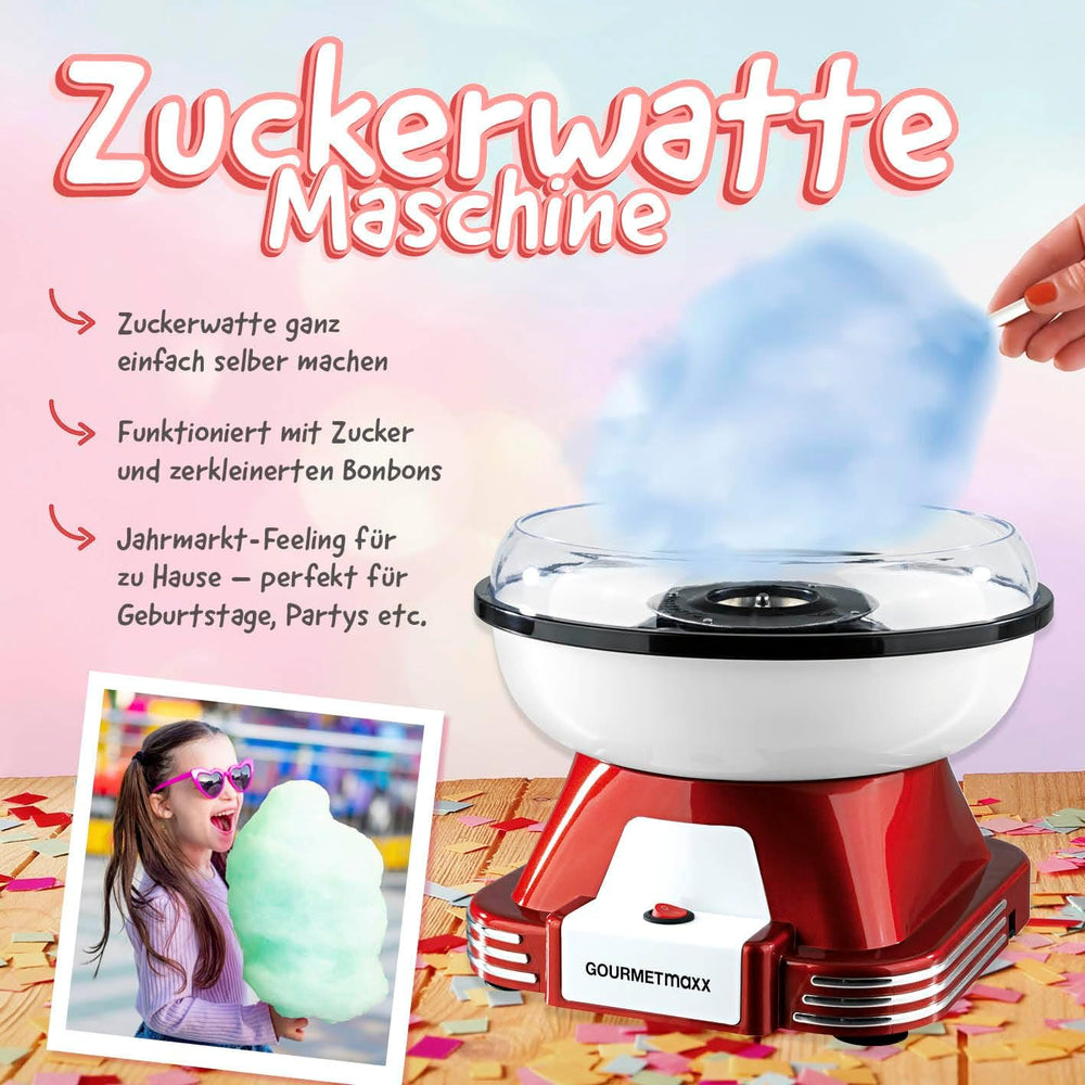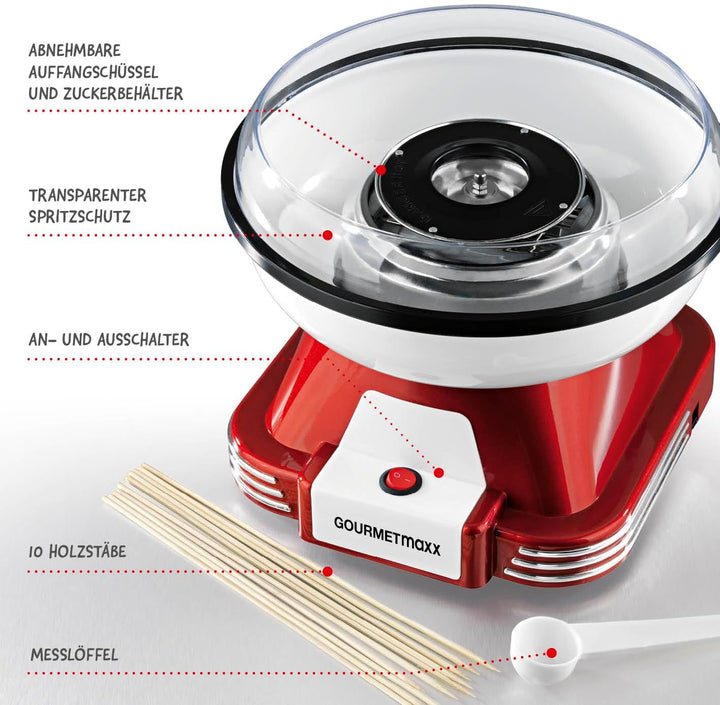 - SÜSSES VERGNÜGEN - Mit dem GOURMETmaxx Zuckerwattegerät machen Sie Kindern und sich selbst eine Freude und erwecken ein authentisches Jahrmarkt, Rummelplatz, Kirmes, Oktoberfest oder Karneval Gefühl. Im Handumdrehen erschaffen Sie süsse Köstlichkeiten für Gross und Klein, Zuckerwatte in vielen Farben oder in Zuckerwatte gedrehte Bonbons.