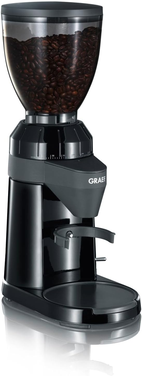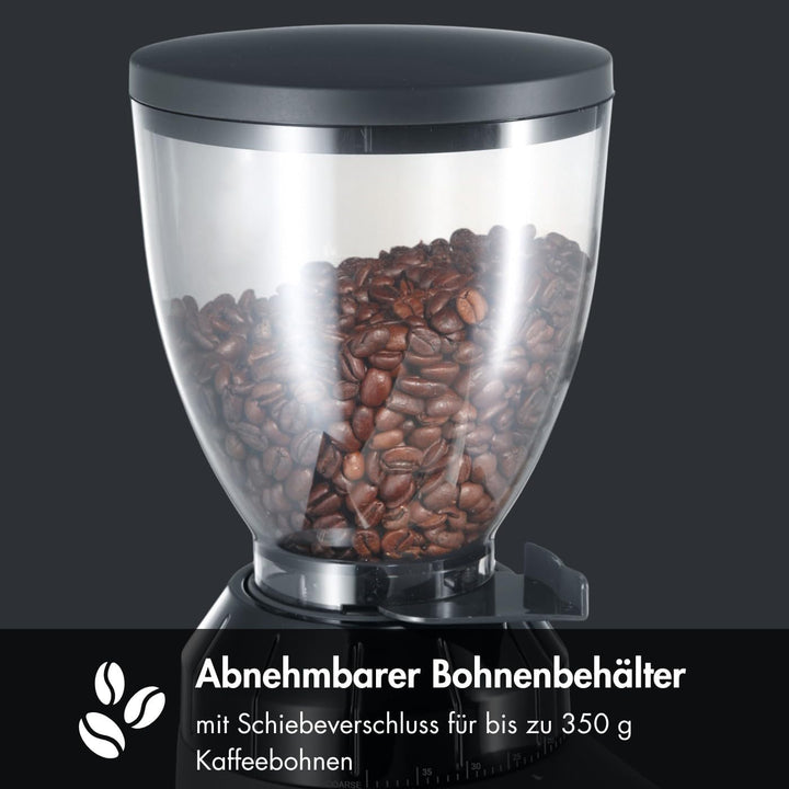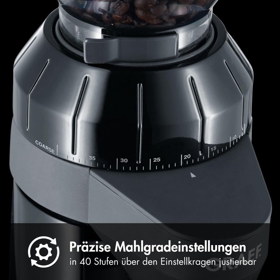 - Kaffeemühle Graef CM 802 aus massivem Aluminiumdruckgussgehäuse mit langsamlaufendem Kegelmahlwerk aus Edelstahl, für aromaschonendes Mahlen der Kaffeebohnen.