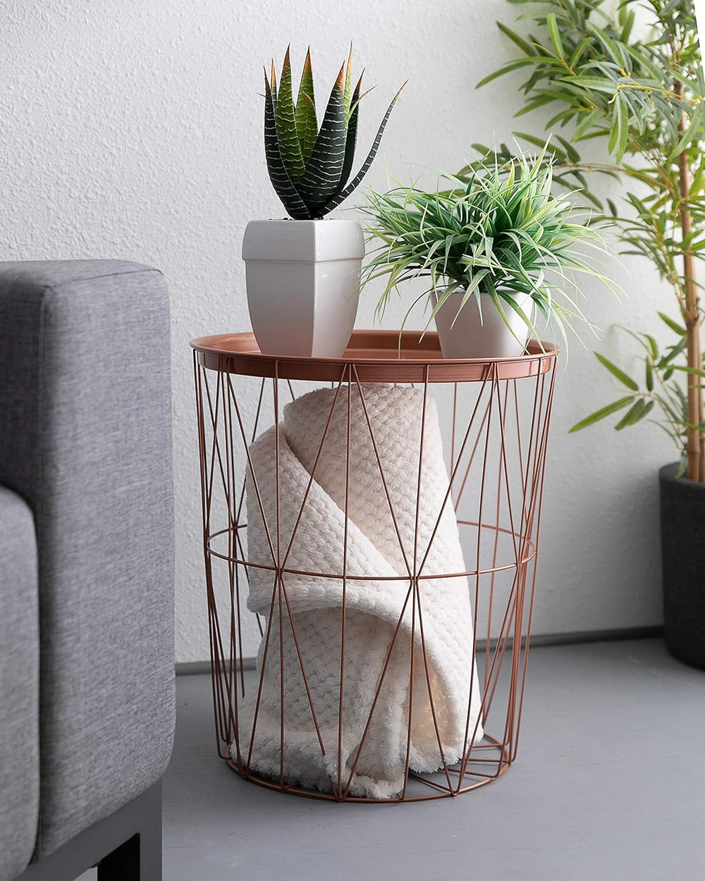 - Tisch-Korb aus kupferfarbenem Stahl in aktuellem Draht-Design – mit Stauraum im Inneren für Decken, Kissen & Co. , ideal als attraktive Dekoration und Accessoire zu Sitzgruppen bzw. Lounge-Möbeln
