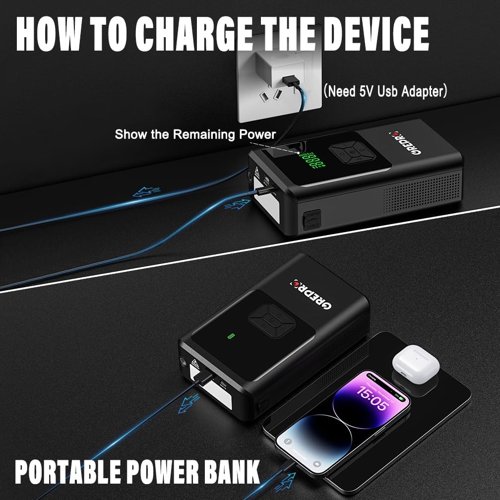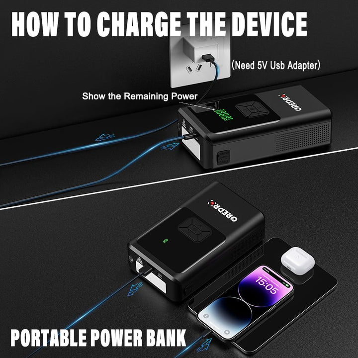 - 【Tragbar Leistungsstarker Starthilfe】GREPRO starthilfe powerbank kann die meisten 12-Volt-Autos, Transporter, Lastwagen, Motorrad, Schneemobile, Rasenmäher und Hochleistung bis zu mehreren Malen bei voller Ladung (bis zu 10.0L Benzin/8.0L Diesel).