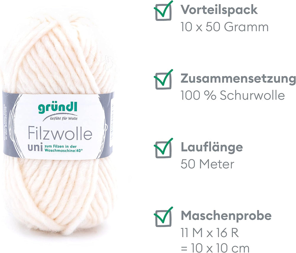 - ZUM FILZEN IN DER WASCHMASCHINE: Die Gründl Filzwolle kann ganz einfach gestrickt oder gehäkelt und anschliessend in der Waschmaschine gefilzt werden. Kleinere Strickfehler und Unebenheiten verschwinden nach dem Filzvorgang.
