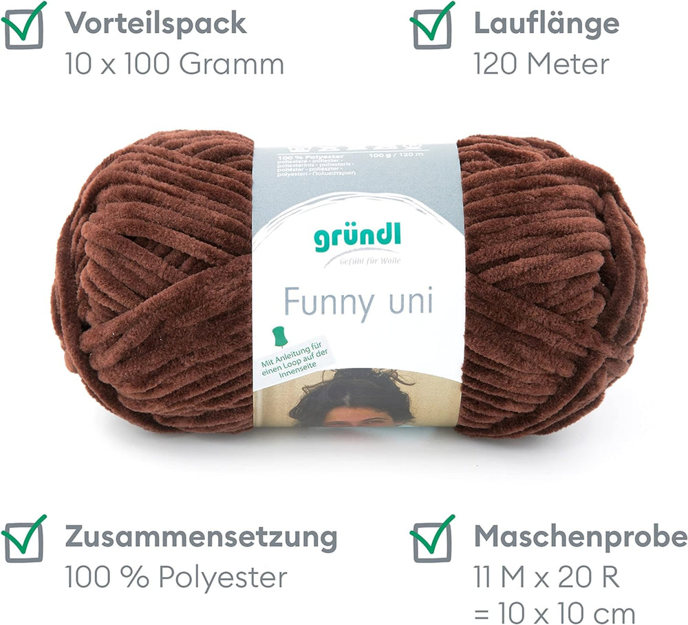 - LIEFERUMFANG & WEITERE EIGENSCHAFTEN: Gründl Funny uni Wolle, 10 x 100 g / 100 % Polyester / Maschenprobe: 11 M x 20 R = 10 x 10 cm / Materialverbrauch: Pullover (Gr. 38) = ca. 500 g