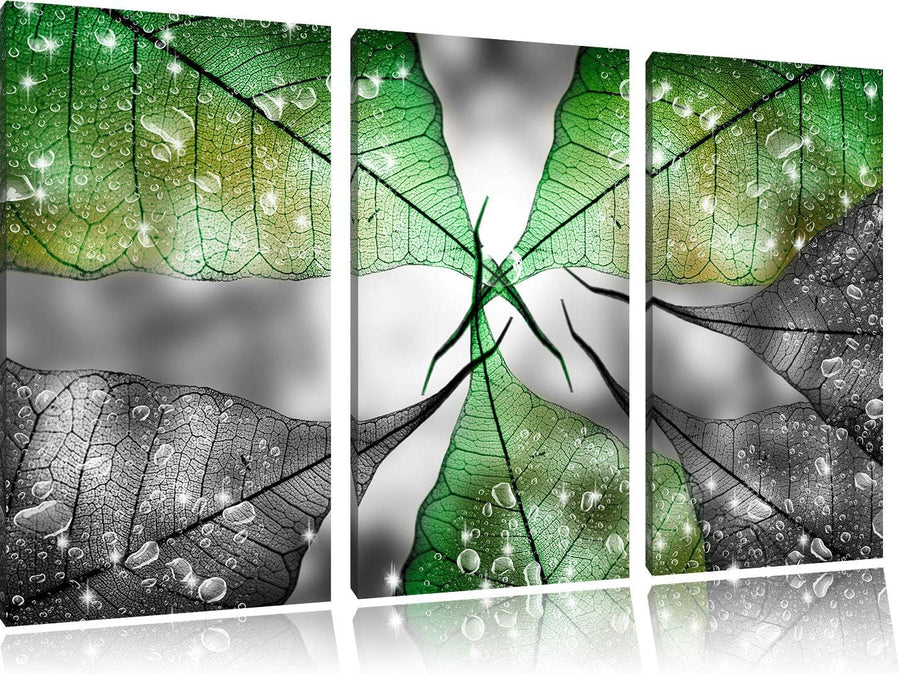 grüne Blätter mit Wassertropfen schwarz/weiss 3-Teiler Leinwandbild 120x80 Bild auf Leinwand, XXL ri
