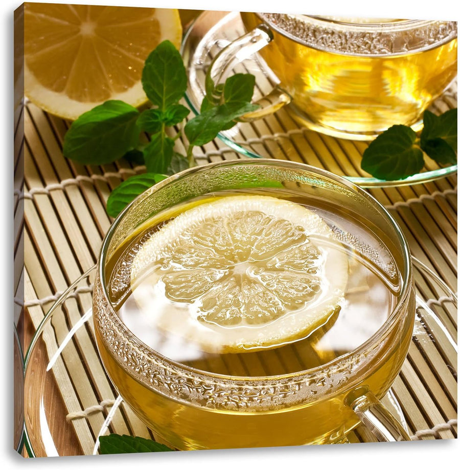 GrünerTee mit Zitrone, Format: 70x70 auf Leinwand, XXL riesige Bilder fertig gerahmt mit Keilrahmen,