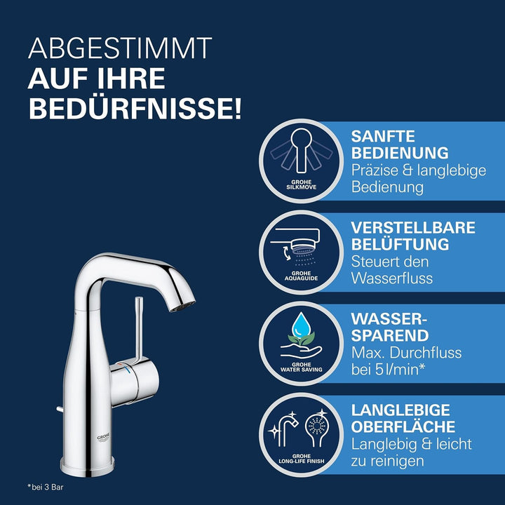 GROHE Essence - Badarmatur - Einhand-Waschtischarmatur (M-Size, mit Temperaturbegrenzer, Einlochmont