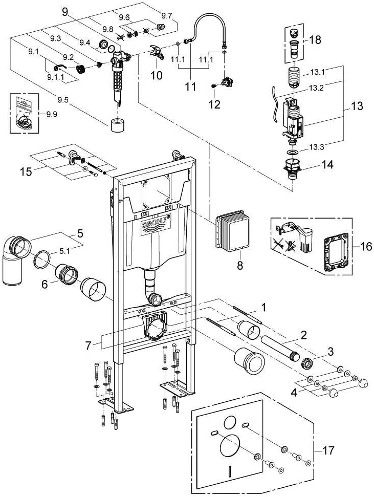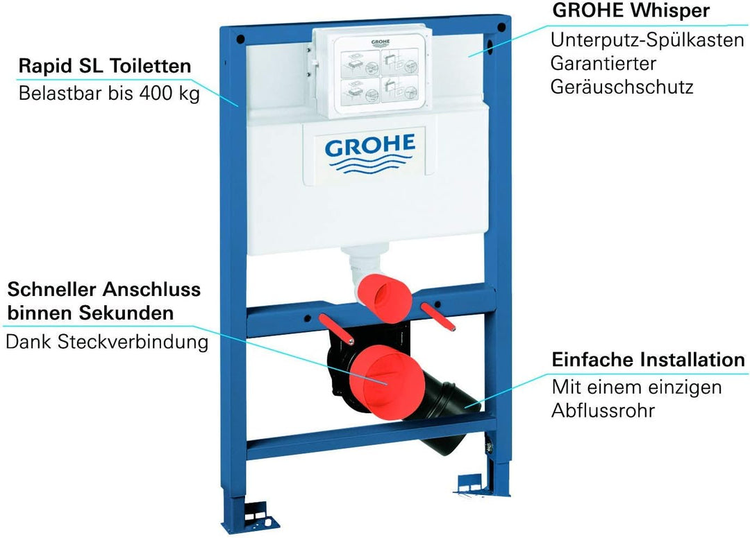 - Lieferumfang: WC Rahmen, Spülkasten universal, Spülrohr, Haltebügel, Halteklammer, Reisionsschacht Rapid SL, Bedienungsanleitung
