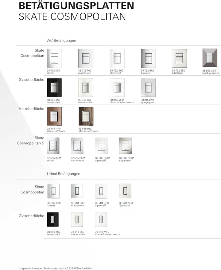 - Lieferumfang: Betätigungsplatte, Befestigung, Pflegehinweis
