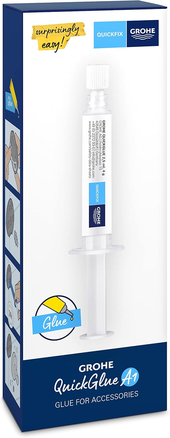 - Mit dem GROHE QuickGlue gehört das Bohren nun der Vergangenheit an. Einfach in der Nutzung und makellos im Ergebnis. Mit der enthaltenen Klebespritze, dem Adapter für GROHE QuickFix Zubehör mit der Wandmontageplatte können Sie Ihre BadAccessoires so